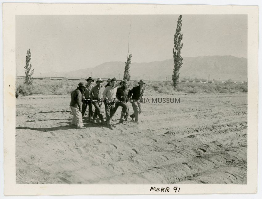 Photograph of a group of incarcerees pulling a harrow through a field near the Manzanar Incarceration Camp. Seven men are pulling the harrow, one is guiding it, and the other is supervising. A row of buildings from Manzanar can be seen in the background, behind which are the Alabama Hills.