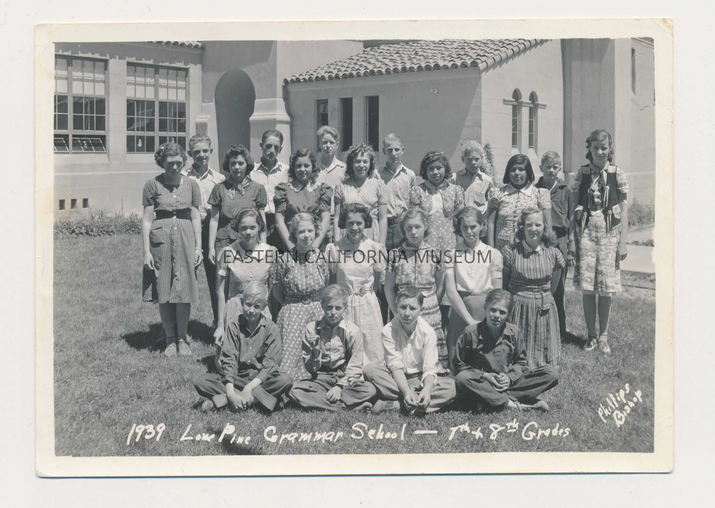 Class photo titled, "1939 Lone Pine Grammar School -- 7th and 8th Grades." It was taken by Curtis Phillips of Bishop.