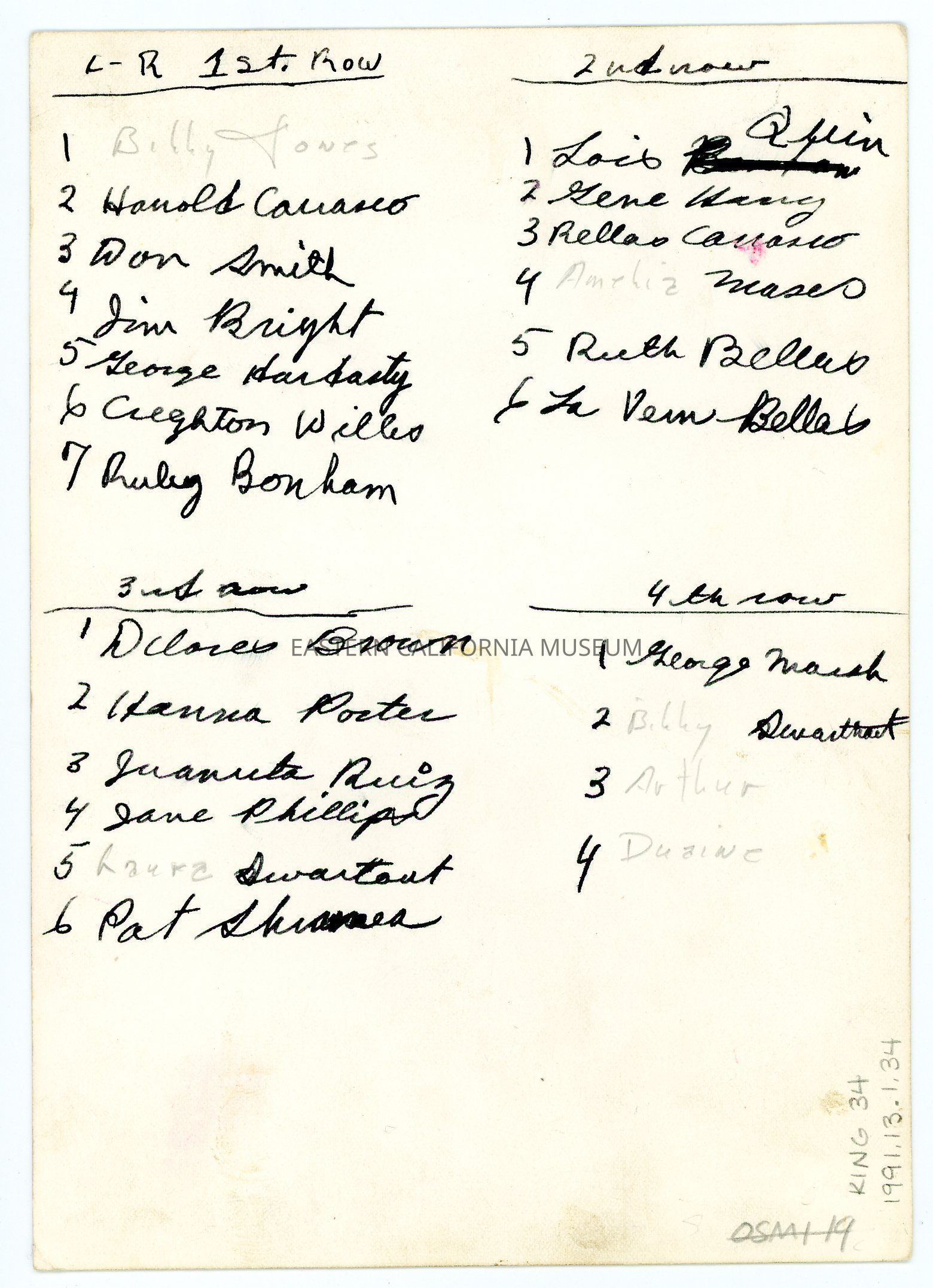 Most of the students are identified on the reverse. 1st row LtoR: Billy Jones, Harold Carrasco, Don Smith, Jim Bright, George Hardasty, Creghton Willis, Ruby Bonham. 2nd row LtoR: Lois Quinn, Gene Harry, Relles Carrasco, Amelia Mases, Ruth Bellas, LaVern Bellas. 3rd row LtoR: Delores Brown, Hanna Porter [Pocter?], Juanita Ruiz, Jane Phillips, Laura Swartlout, Pat Skinner. 4th row LtoR: George Marsh, Billy Swartlout, Arthur, Duaine.Photograph Details