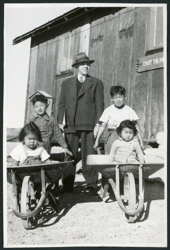 Photograph of Albert R. Chamberlain, Ned and Harry Morioka and two other children posing in front of the infirmary at Cow Creek Camp in Death Valley National Park. Ned and Harry are holding the handles of two wheelbarrows which hold the other two children. Incarcees were transferred to the former Civilian Conservation Camp after the Manzanar Riot for their own protection.