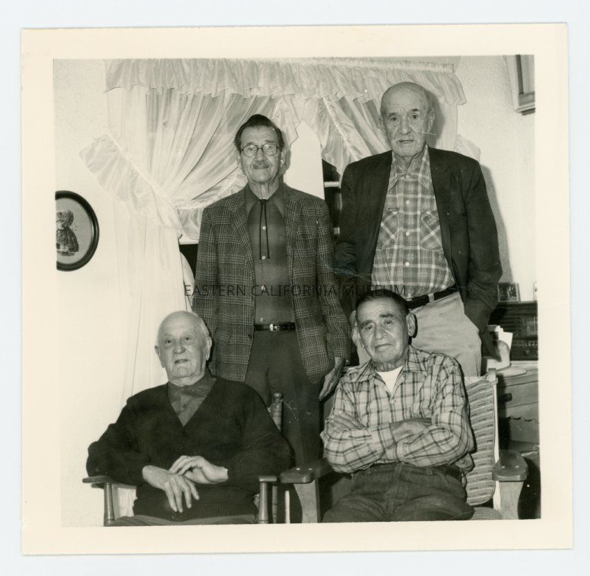 Handwritten in black ink on reverse: Last end of the second generation of the pioneers of Lone Pine, Ca. Taken 11-3-77. Back row left to right: Bev. R. Spear born Dec. 26, 1894; Thomas S. Hancock, Dec. 24. 1891. Front row left to right: Robert W. Harry born July 11, 1889; Feliberto Castro Nov. 27, 1892. Not in picture: John C. Autore Oct. 10, 1892. These represent 428 years of living for Inyo Co.Made/Created