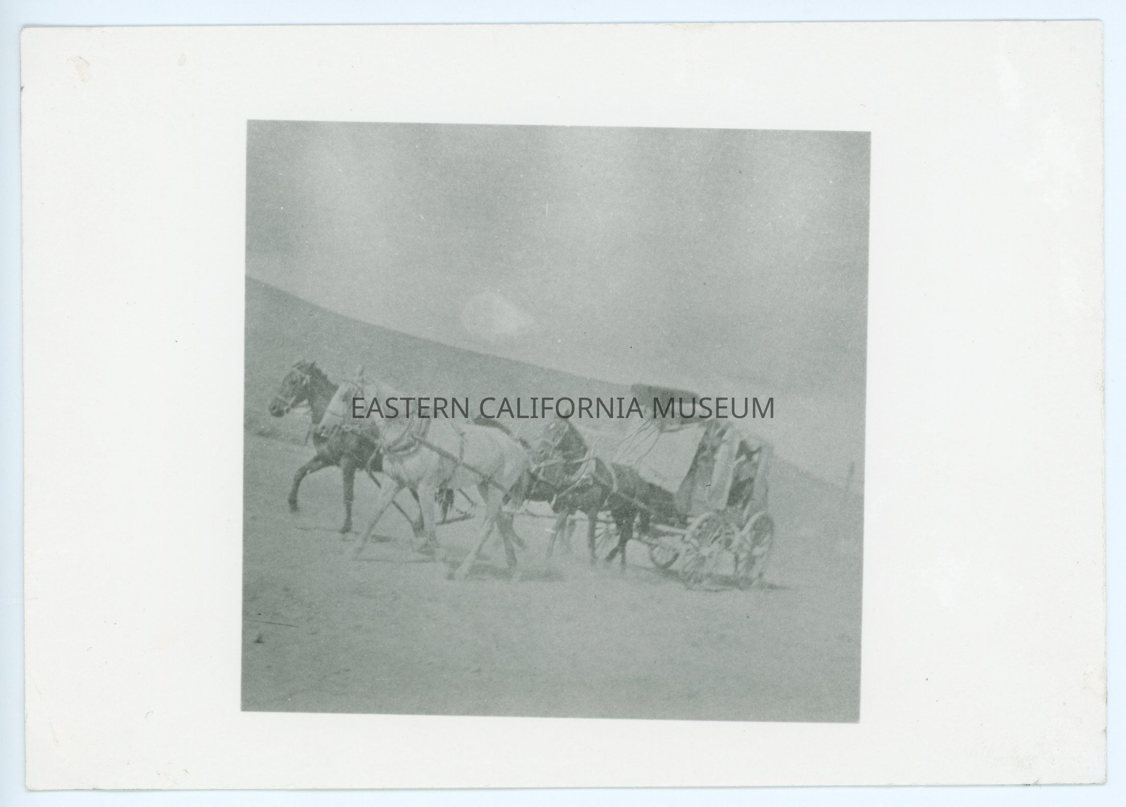 A617.28--Stagecoach coming in from Johannesburg to Skidoo. 112 miles. 1908. (Notice canvas wind break on coach)