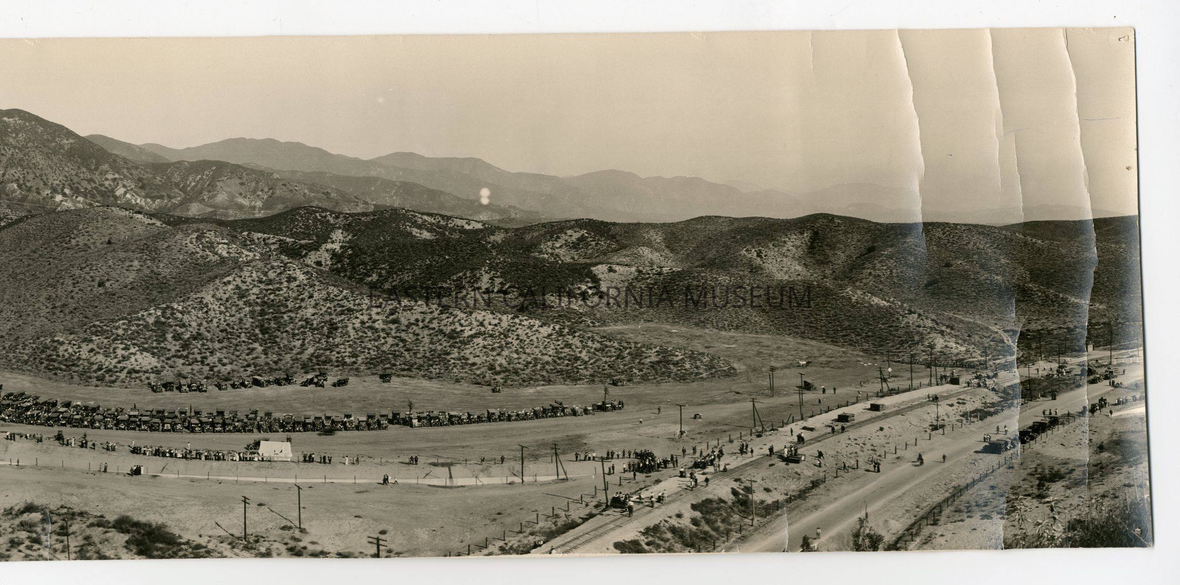 Panorama photo titled, "Cascades, L.A.A., Nov. 5, 1913" taken by Bledsoe Photo Co. It shows water rushing down the spillway during the aqueduct dedication ceremony with a crowd of onlookers.Collection