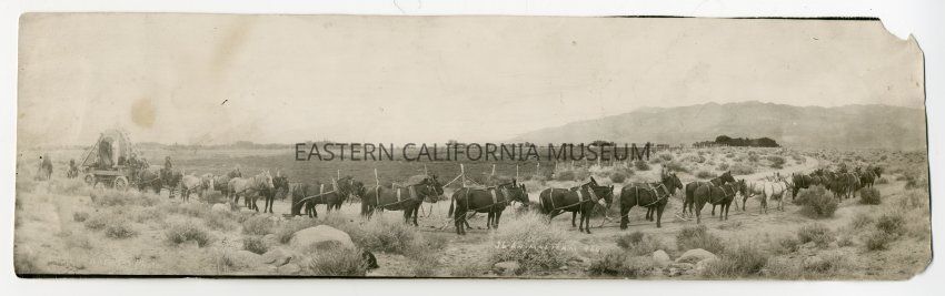 Panorama photo labeled, "26 Animal Team" by A. A. Forbes and given his photo ID #966. Photo is of men and horses/mules hauling hydroelectric generators to power plants on Bishop Creek. Top right corner is torn off.