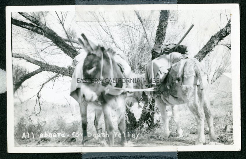 B&W. Postcard of two loaded mules or burros or donkeys with the caption, "All aboard for Death Valley."