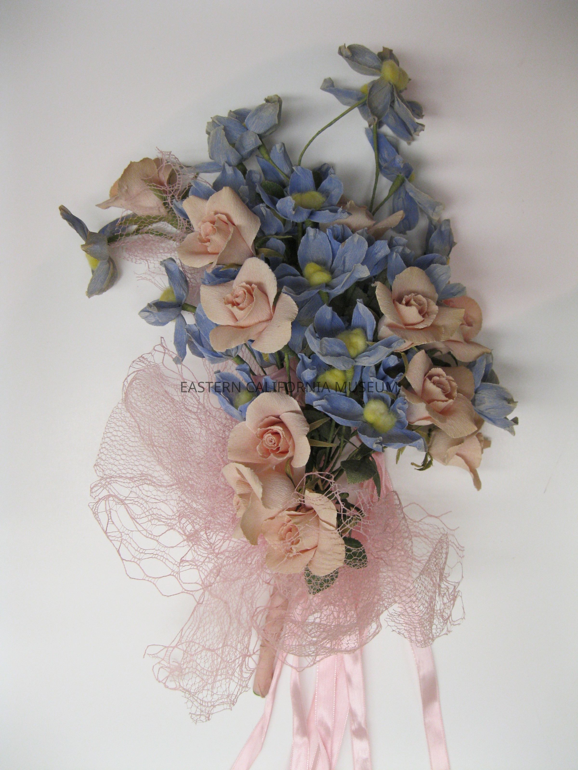 Bouquet consisting of pink and blue flowers with green leaves, pink ribbon and pink netting. It and its accompanying headpiece were worn by attendant Claire Ayako Harada Nakashima (09/29/1923-12/19/2019). They were made by the Manzanar Flower Shop for the wedding of Mark Nakamura and Anna Marie (Aiko) Miyamoto on February 27, 1944, which was held at the Manzanar Catholic Church and officiated by Maryknoll priest Father Leo Steinbach.Collection