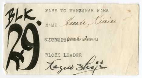 Pass to Manzanar Park for Kimino Harada. Address 29-9-3. Block leader's signature (Kageo Shoji?). Calligraphy "Blk. 29" on left side. Paper is tissue thin.Collection