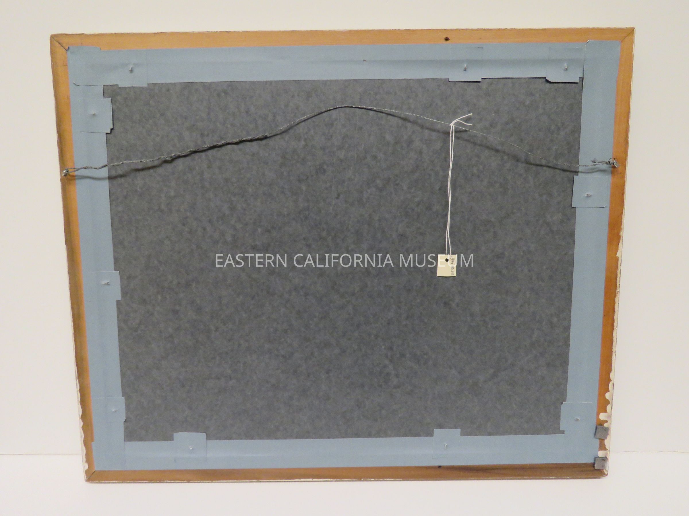 A framed embroidery created by Taka Honda while interned at Manzanar War Relocation Center from 1943-1945. It is a scene of Manzanar War Relocation Center with Mt. Williamson in the background. There are two rows of barracks with a sign (or basketball backboards?) and single building in the center. The colors of thread used include blues, greens, white, and earth tones.