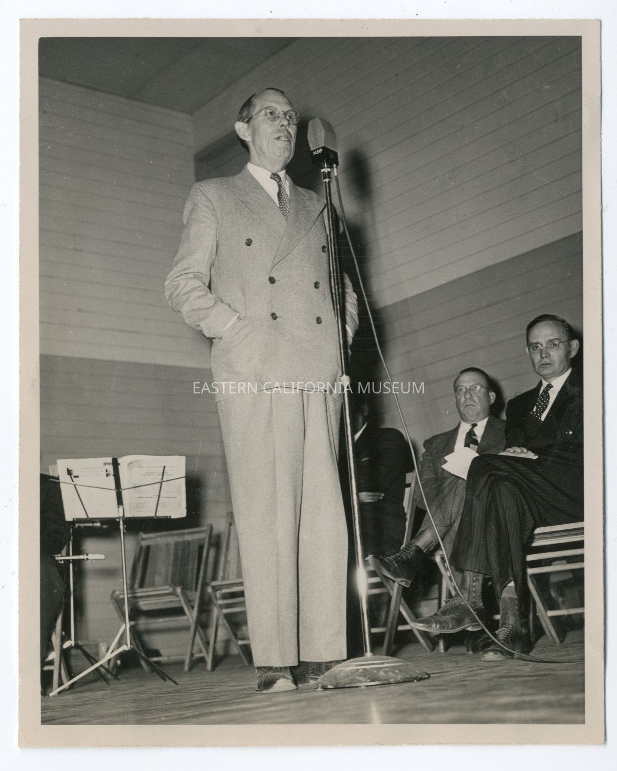 B/w photo of Ralph P. Merritt speaking into a standing microphone. There are three men sitting in wooden folding chairs behind him. There is a music stand to the left. He appears to be standing on the stage of the Manzanar Auditorium.Photograph Details