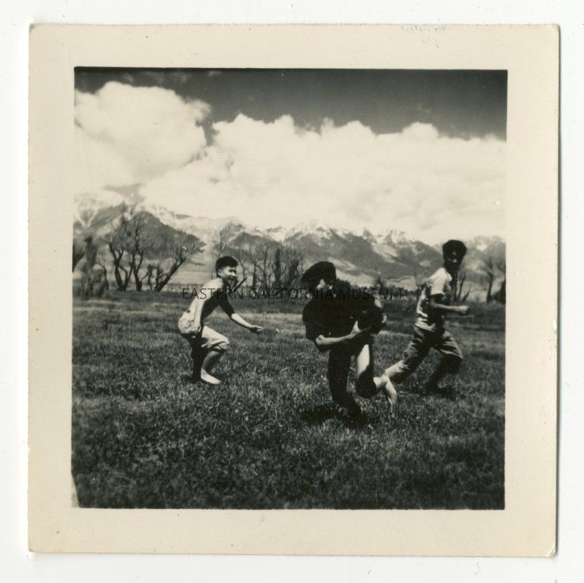 From Genzo Nishida's pics. Exterior photograph of three young men running with a football on the grass. The Sierra are visible behind them. This is part of a picnic event in South Park area south of Manzanar.Photograph Details
