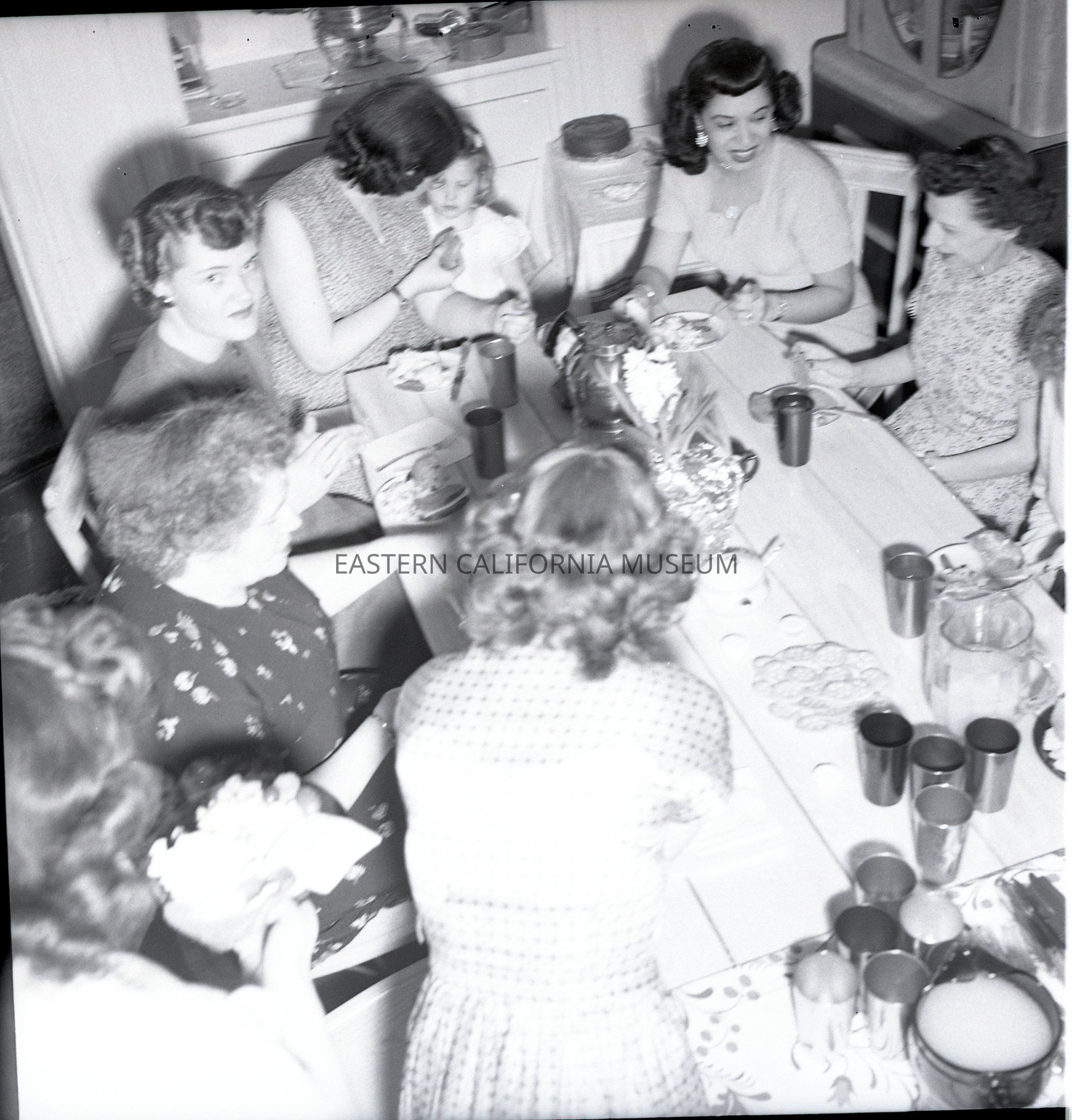 Negative of a group of at least nine women seated around a table with snacks and drinks.