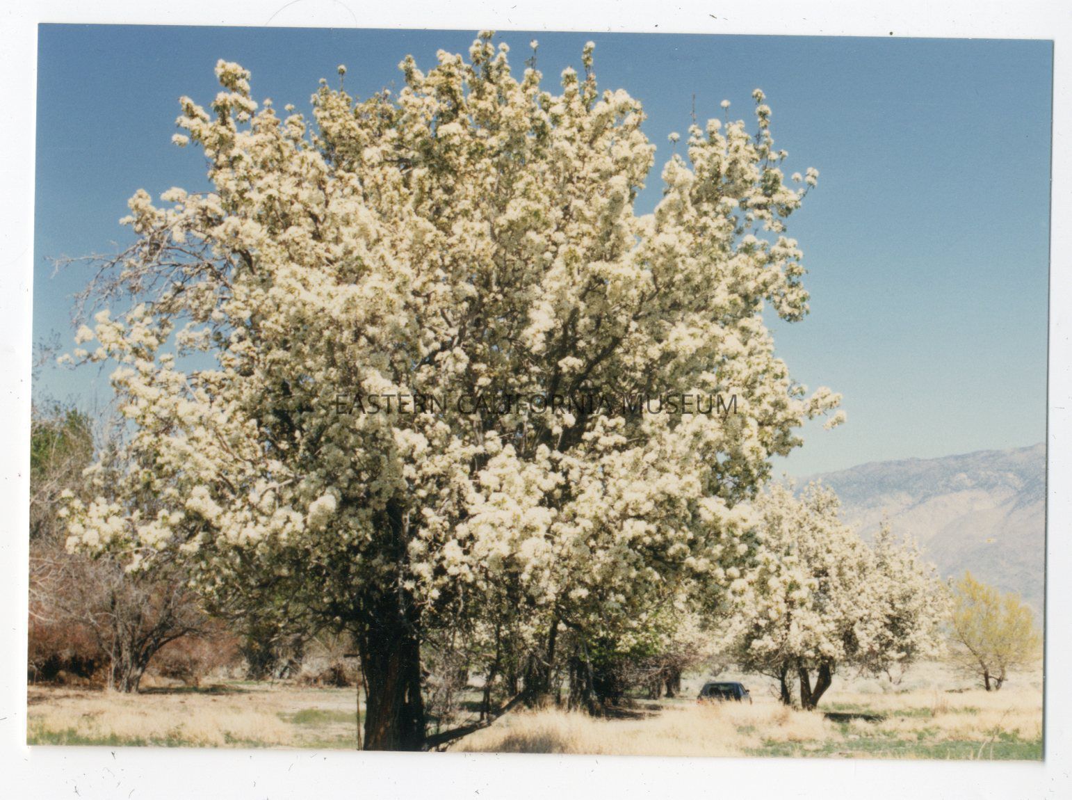 Color photo of an orchard blossoming with white flowers. There is a car parked in the shade.