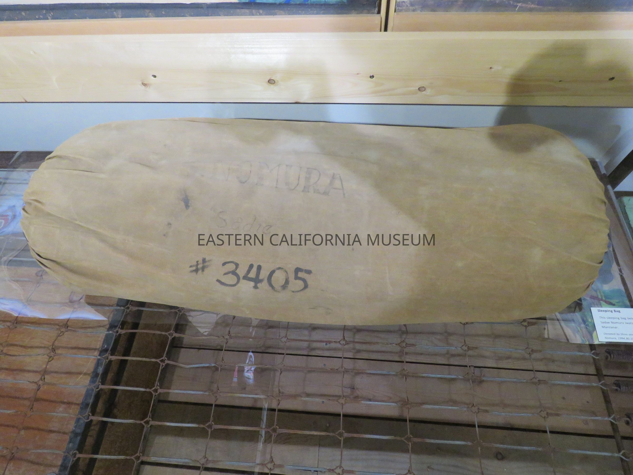 Tan color sleeping bag and pouch with "S. Nomura #3405" written on it. It belonged to Sadae Nomura Iwataki, resident of Manzanar War Relocation Center Block 21.Collection