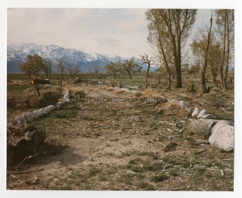 Color photograph of pathway lined with rocks leading to North Park, on the site of Shepherd Ranch, north of Block 32 in Manzanar. Trees are next to the path, with the Sierra Nevada in the background. A label places this photo circa 1980.Photograph Details