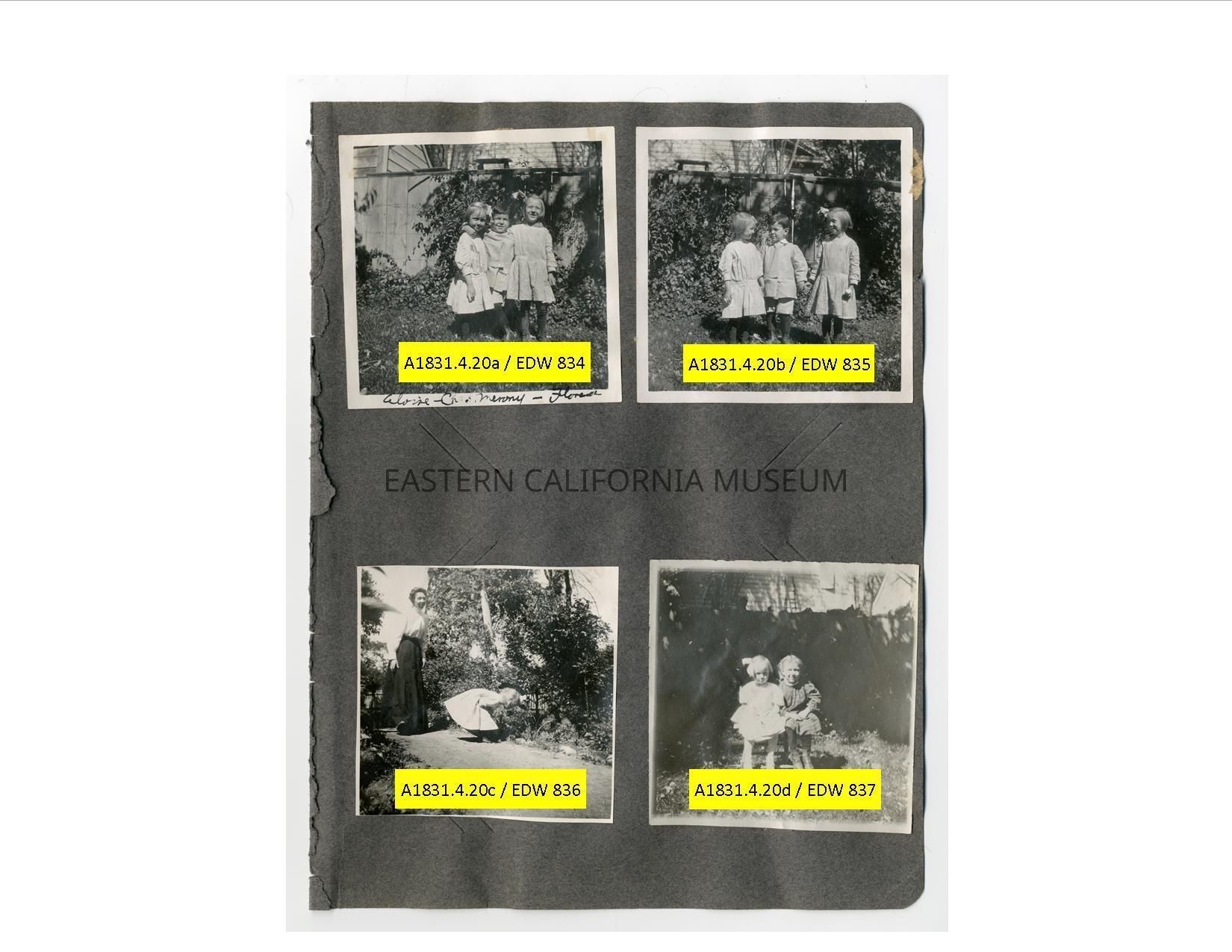 A1831.4.20b: Exterior photo of three children standing on a grassy lawn. They are identified as Eloise, Charles Merony, and Florence.
