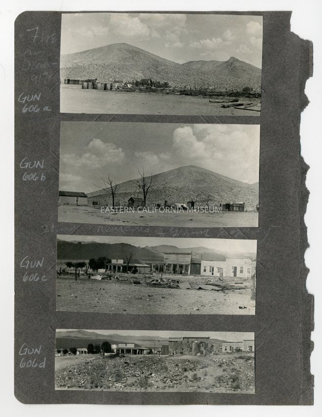 A1831.4.41b: Photo of the town of Darwin after the August 17, 1917 fire. Two blackened trees stand out in this photo. Either this photo or the one below it shows the remains of Mr. Gunn's property.