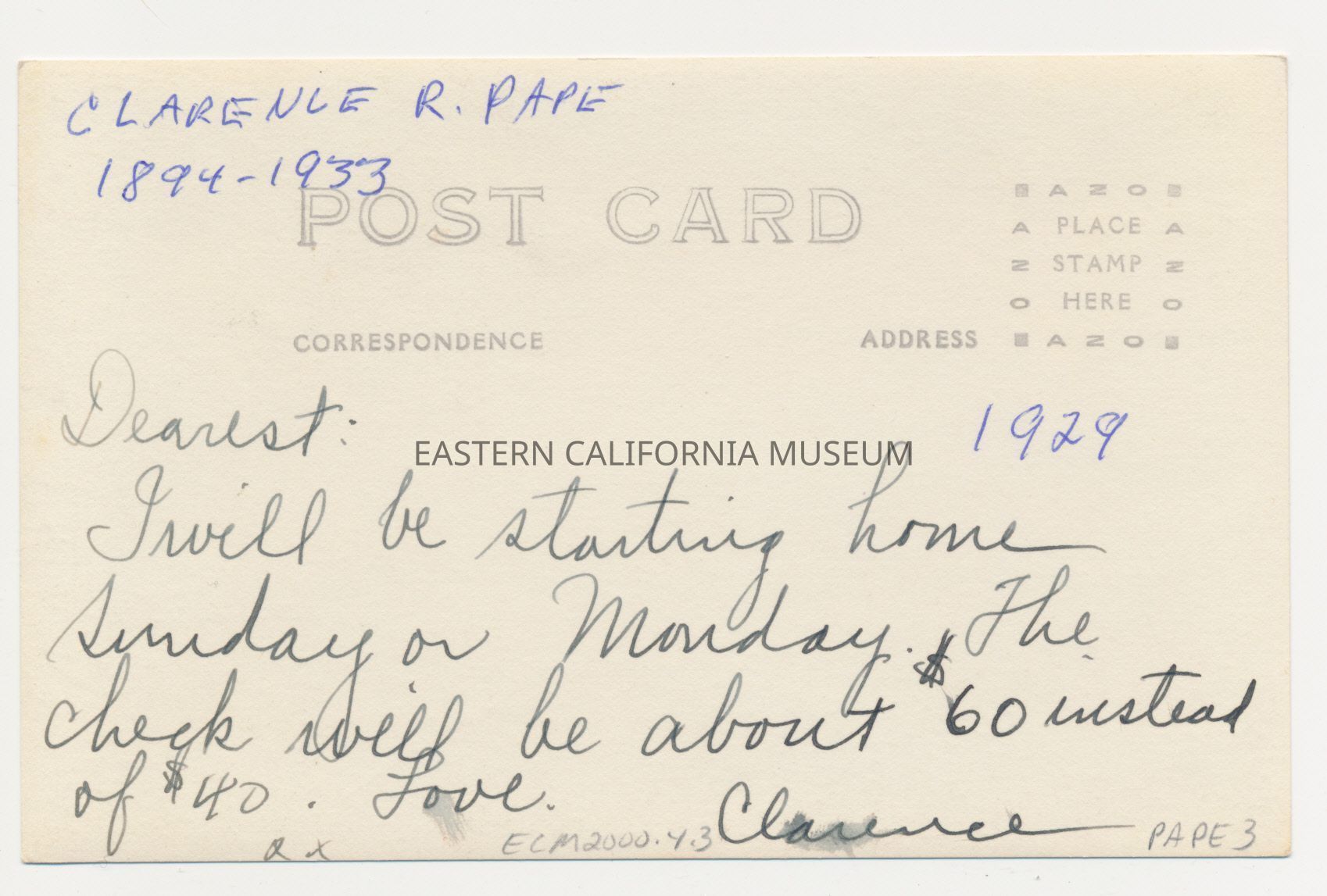 This postcard was filled out but never sent. The message says, "Dearest: I will be starting home Sunday or Monday. The check will be about $60 instead of $40. Love, Clarence."