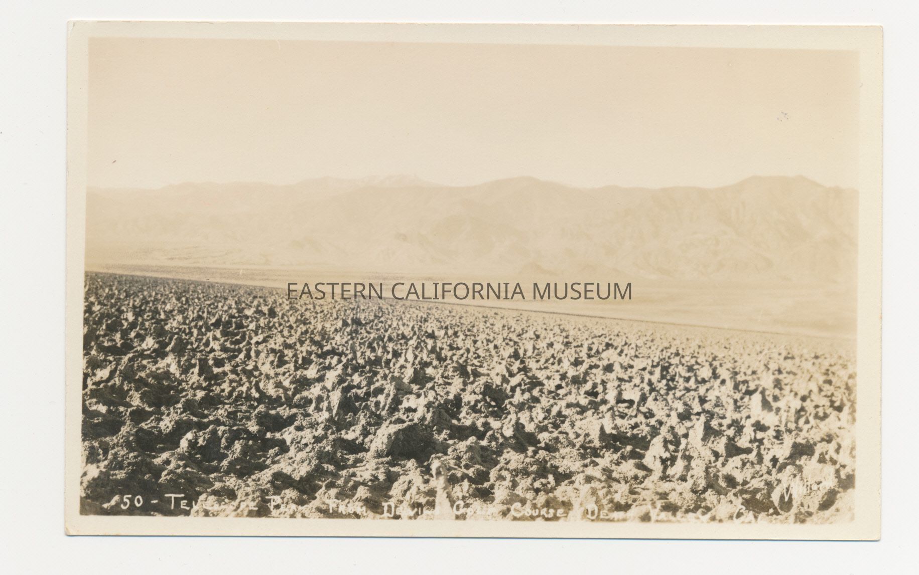 Photo postcard titled, "50 - Telescope Peak from Devils Golf Course, Death Valley, Calif." taken by photographer Stephen Willard.