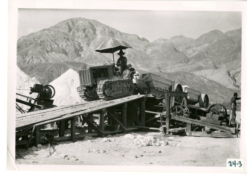 B/w photo of a man driving a tractor (with an umbrella over his head) over a wooden ramp structure. The tractor is hauling two salt carts or "buggies." There is one other men also in this photo. Huge salt piles and mountains in background.