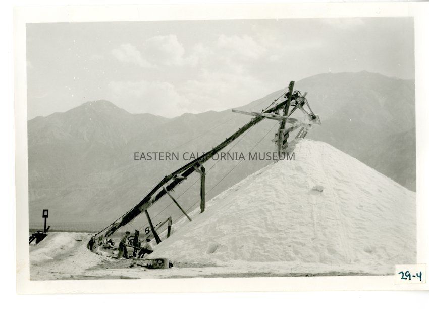 B/w photo of a tall/vertical conveyor-like machine and a huge pile of salt.