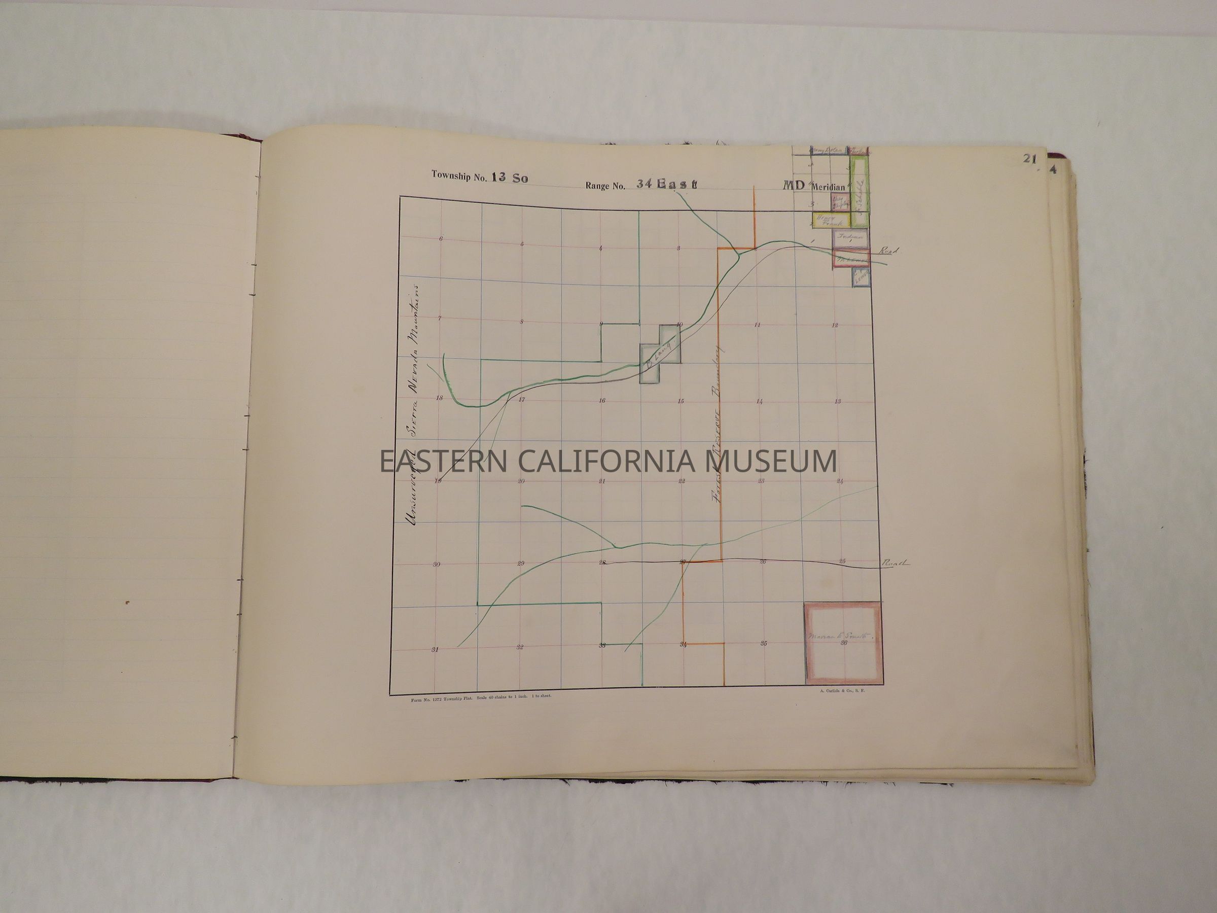 Bound plat map book showing land ownership from Bishop to Olancha and Keeler, c.1920s (there are many City of Los Angeles holdings). Inside front cover is written "Plat Book 3."