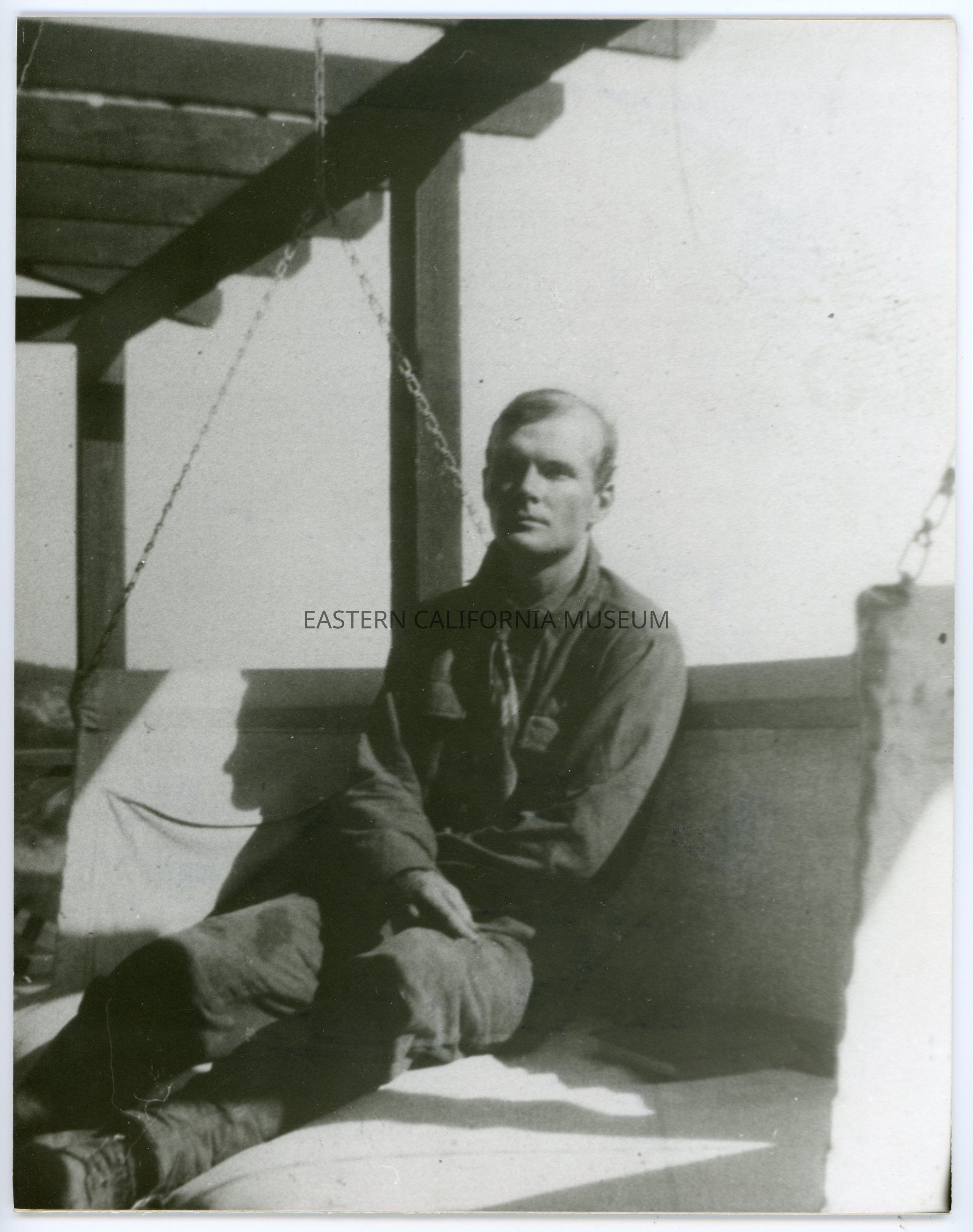 Mounted photo of Norman Clyde as a young man sitting in the outdoor patio at a sanitorium where his wife, Winifred May Bolster Clyde, was being treated. She passed away on 02/14/1919.Collection