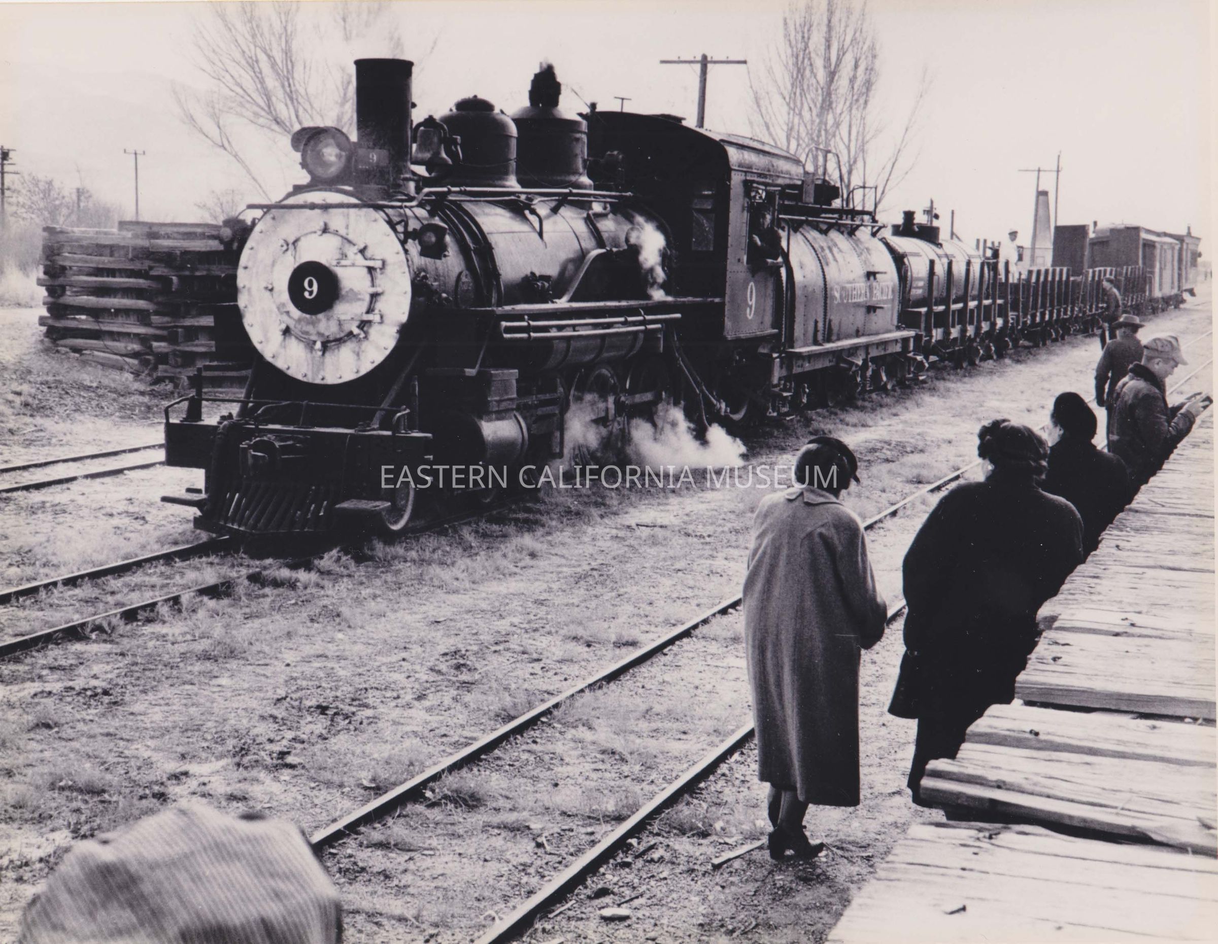 Copy of a photo of the last run of SPNG locomotive #9 at Laws. There are several people in the foreground standing beside the station platform.Collection