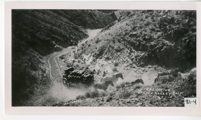 B/w photo of a wagon full of sacks being hauled by at least seven horses or mules. Two men on horseback on road behind the wagon. Writing on front: "Freighting Saline Valley Salt" and "1567" and "A. A. Forbes."