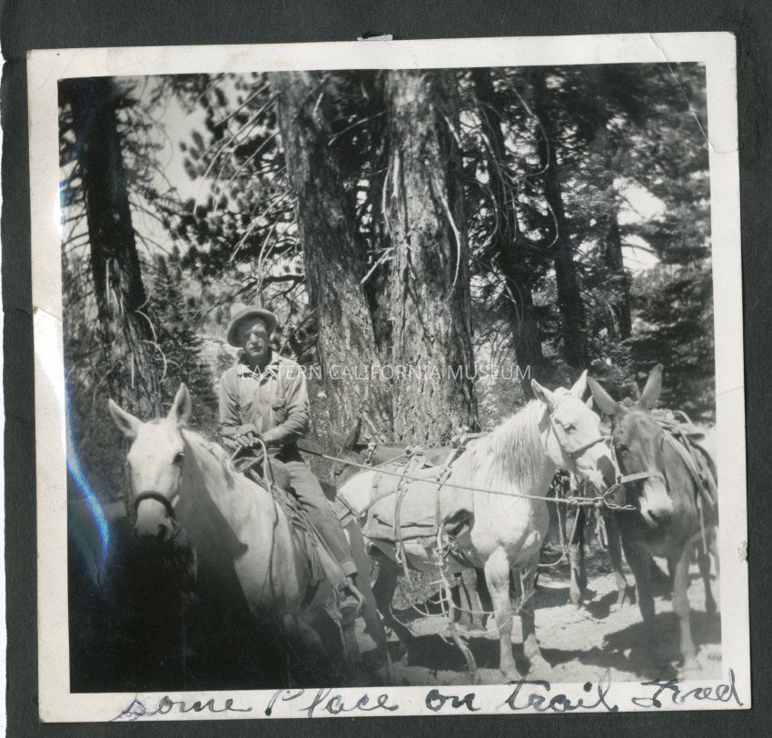 Fred Moore mounted on a horse holding the lead of at least two other pack animals. Handwritten caption says, "Some place on the trail. Fred."