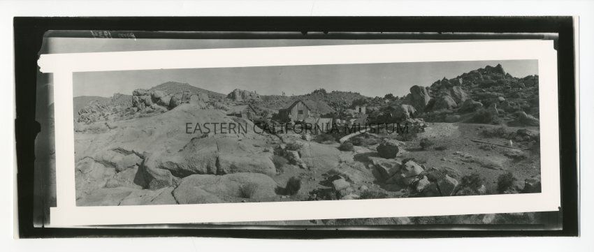 Copy of a panorama photo of several wooden buildings in a rocky, boulder-strewen landscape. Maybe a mining camp? Possibly a Ramsey photo?