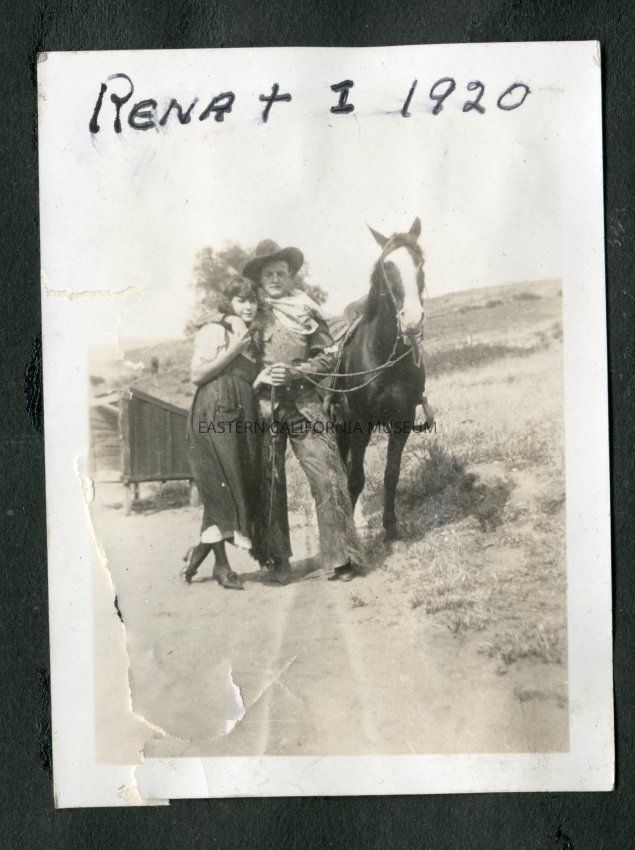 Fred Moore wrote the caption on this photo, "Rena and I 1920." Photo of Rena Beth Moore and Fred Moore posing together. Fred is holding the reigns of a horse with his other arm around Rena's shoulders. Fred is wearing chaps. Photo has been substantially damaged and torn.