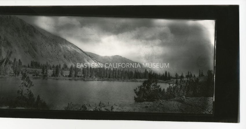 Copy of a panorama photo of a lake surrounded by trees and a mountain. It is very dark--maybe an issue with the negative or development? Written in pencil on reverse, "Big Pine Lakes?"