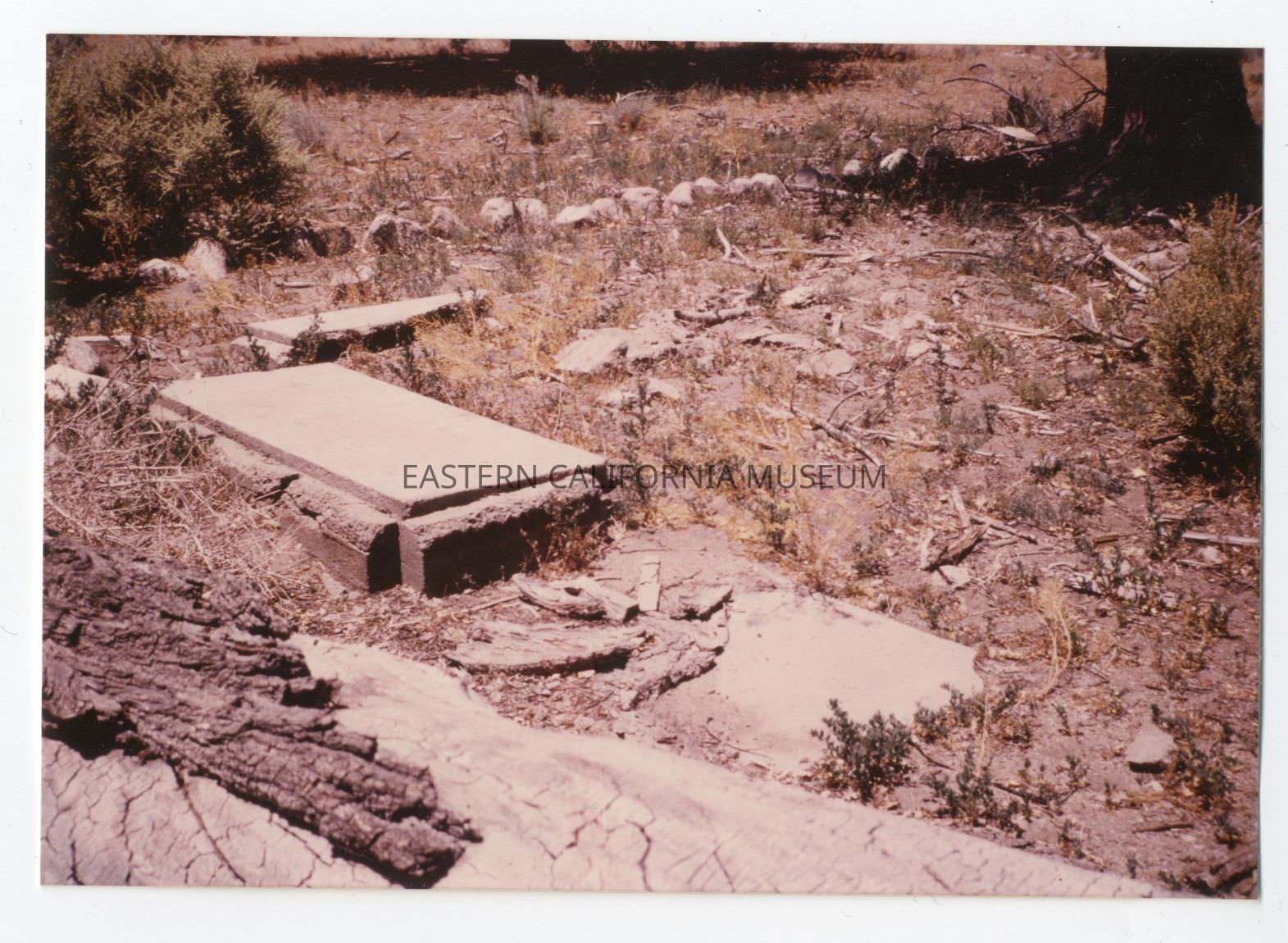 Color photo of some concrete remains and rock border at Manzanar.Photograph Details
