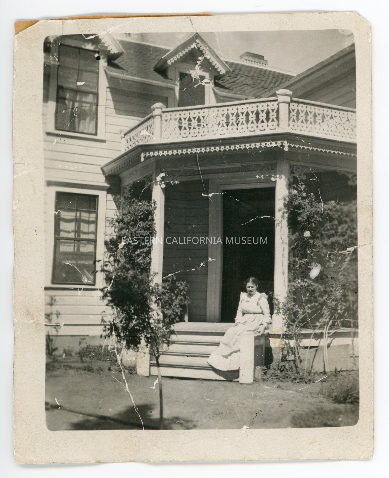 Damaged photo of a woman sitting on the front porch of the Commander's House in Independence.
