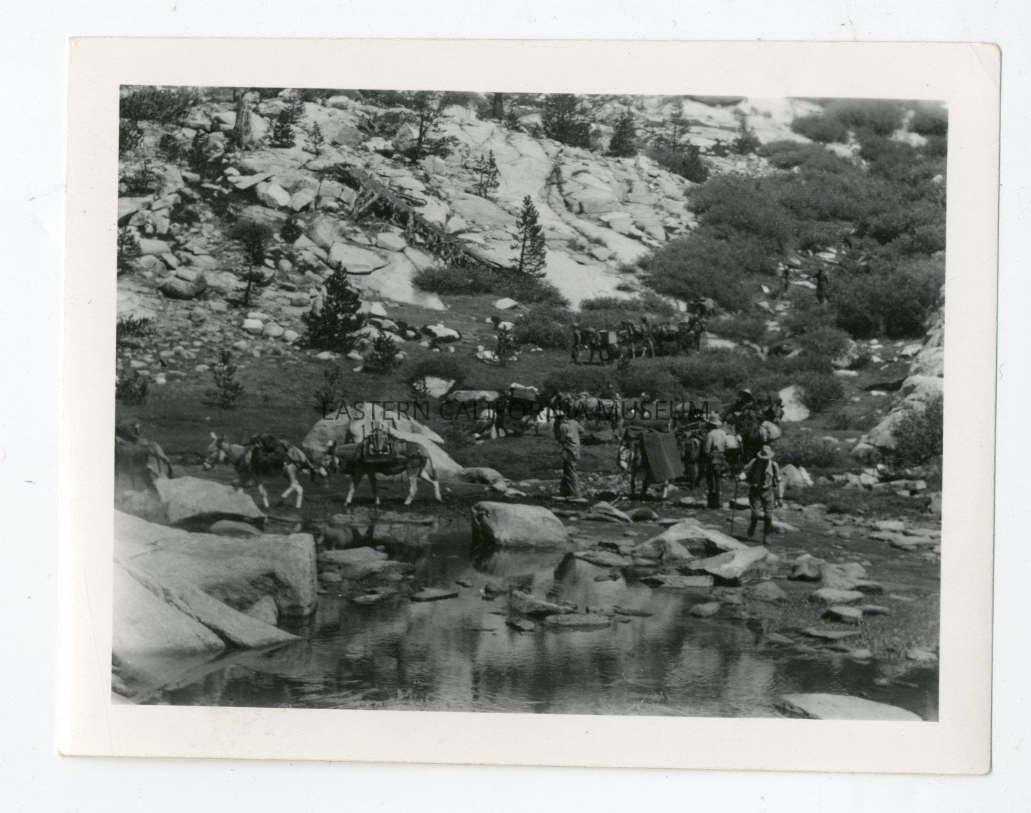 Written in pencil on reverse: Outfit crossing boggy ground at foot of 9 Echos Trail. Jesse's line crossing, Rubin starting across, followed by Combs, Bassler at right, Irvin 6 line on hill in background, Kerr and Moulthrop bringing up rear. BPBJr.Made/Created