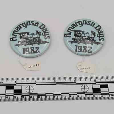 Two buttons from the 1982 Amargosa Days celebration. They are on a light blue background with black ink and an image of a locomotive in the center.