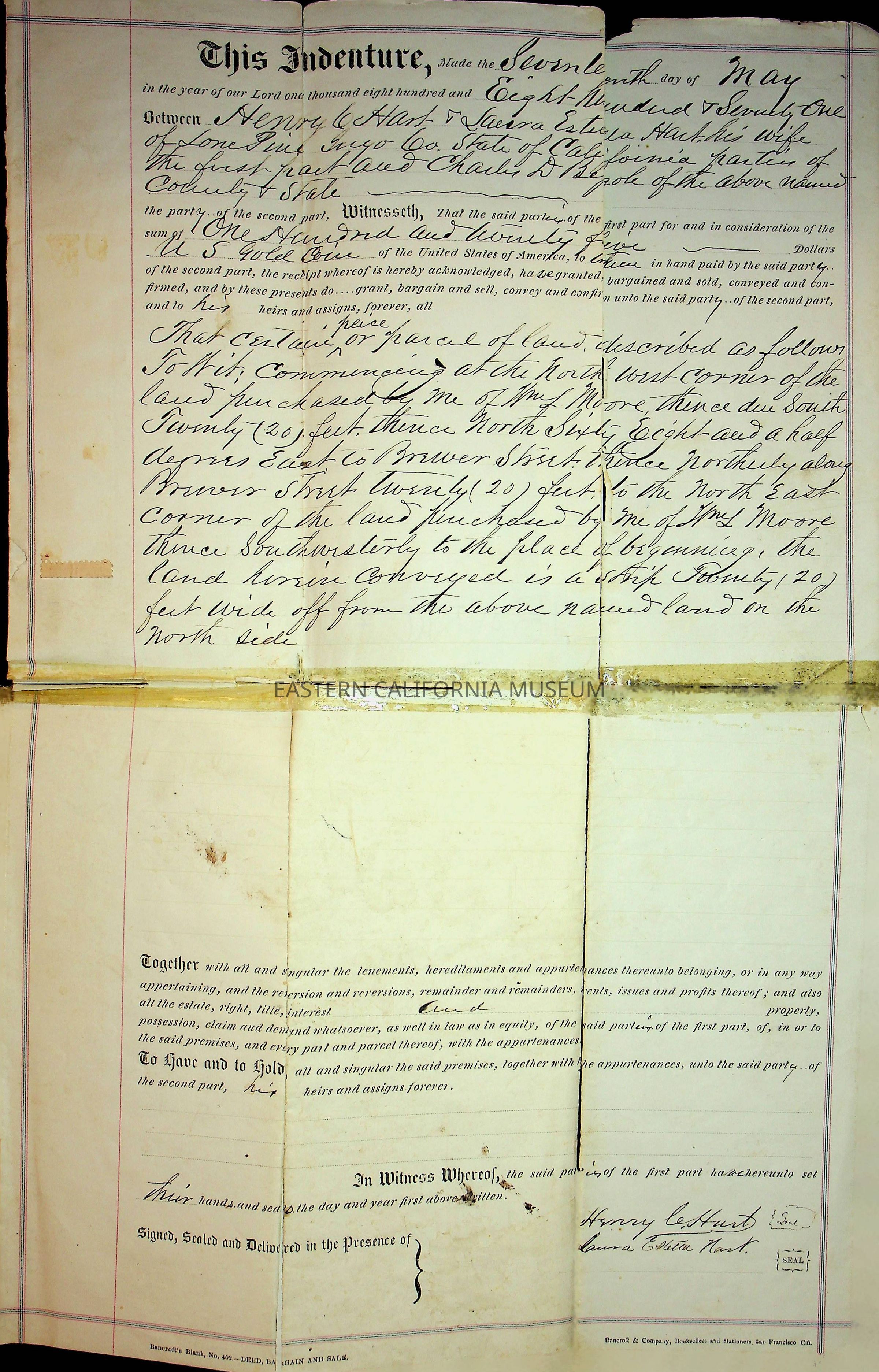 Deed from Lone Pine dated May 17, 1871. It is made out to Henry C. Hart, Laura Estella Hart, and Charles D. Begole. The deed was for the 1959 location of Nadine's on Main St.