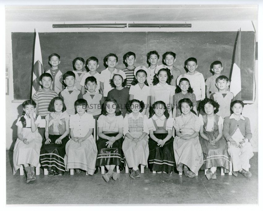 Copy of a photo of the 4th grade class at Manzanar War Relocation Center in 1945. The teacher was Miss Mildred Whitacre, a graduate of UCLA. Saburo Sasaki is in the photograph, but not specifically identified.Collection
