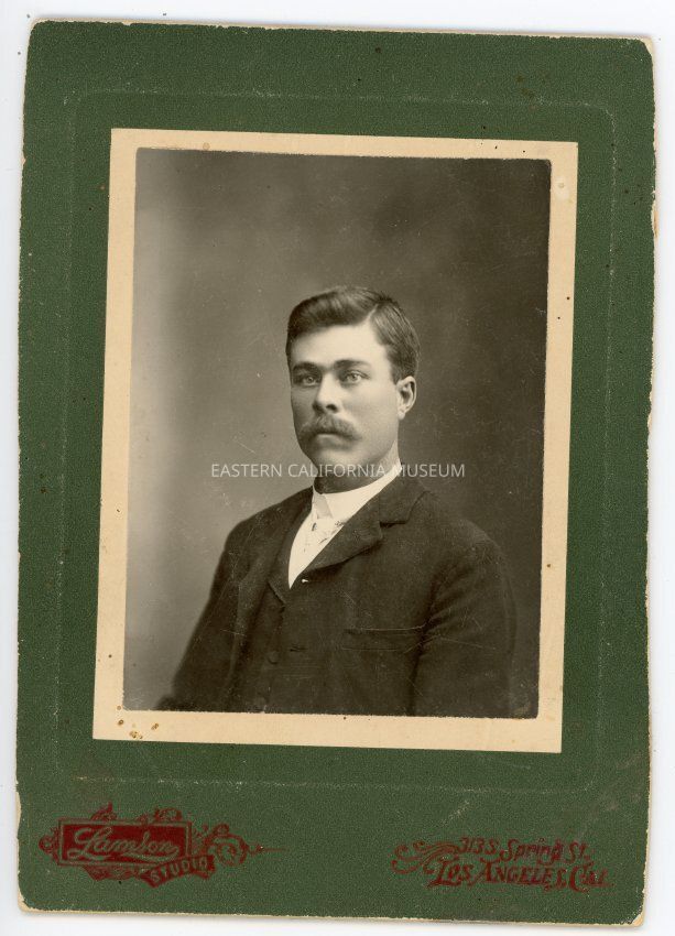 Mounted photograph of Ollie Dearborn. He has a moustache and a part in his hair over his left eye. Backing is green. Photographer was Lamson Studio of Los Angeles.