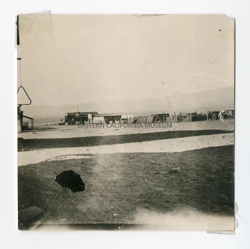 Small black and white photo of a row or street of buildings, fences, and pens (for animals/livestock?). Photo is taken from a distance, and there is a hanging triangle on the left side.