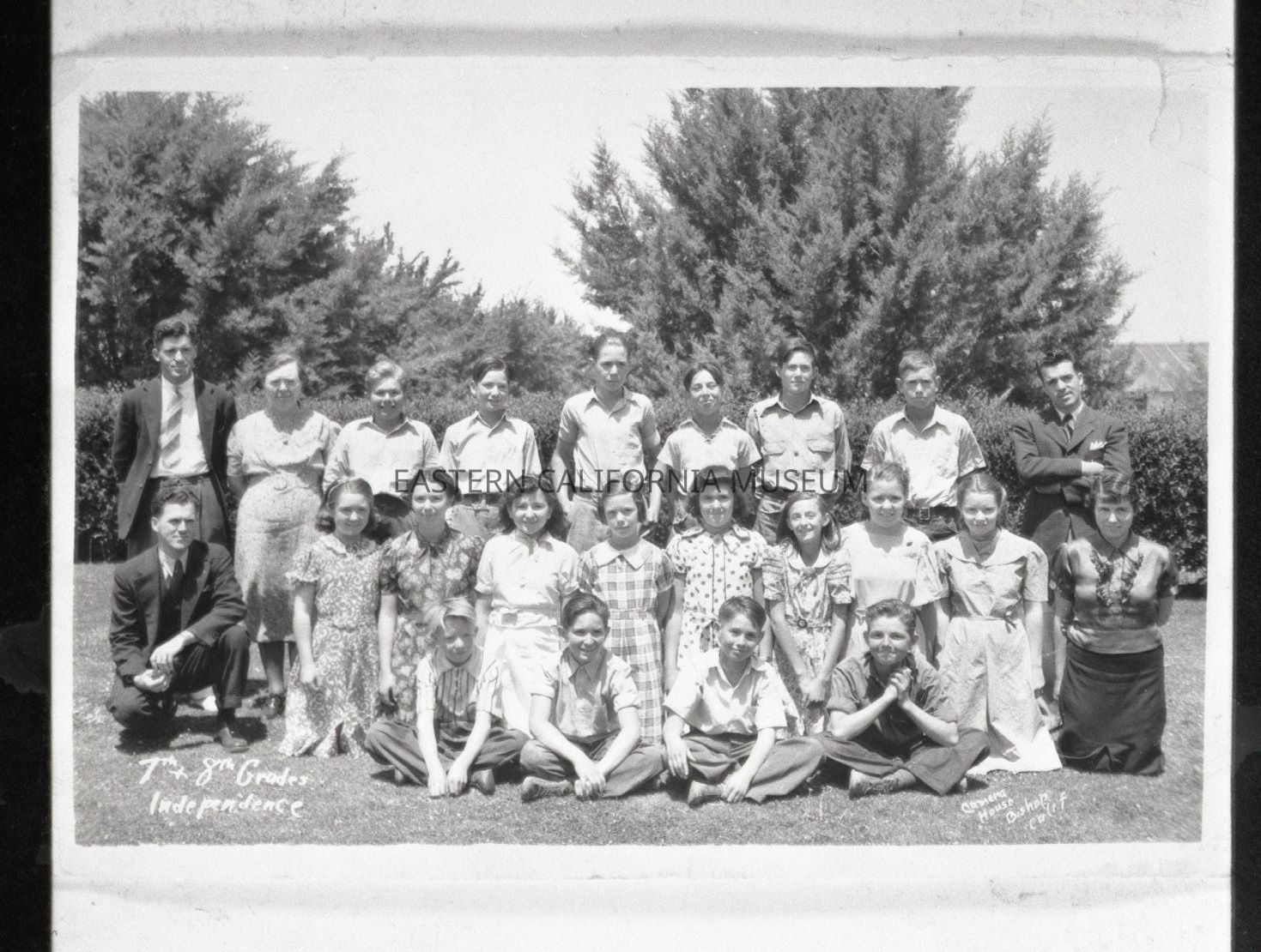 Negative of a class photo of students at Owens Valley School. The photographer was Curtis Phillips of Bishop. It was likely taken in the 1930s.