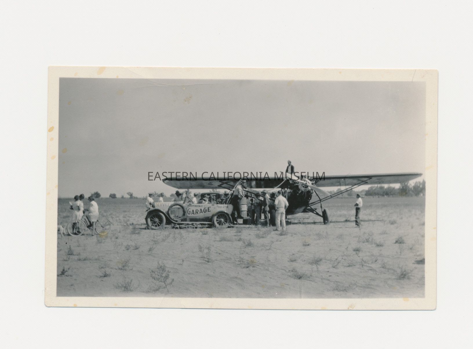 Photo of a vehicle parked beside an airplane. The car has "Independence Garage" painted on the side, and the plane is being used for the Civilian Pilot Training Program during WWII. One man appears to be handling a barrel--possibly refueling the plane? There are also three people [locals?] clustered around a bike to the left side of the photo.
