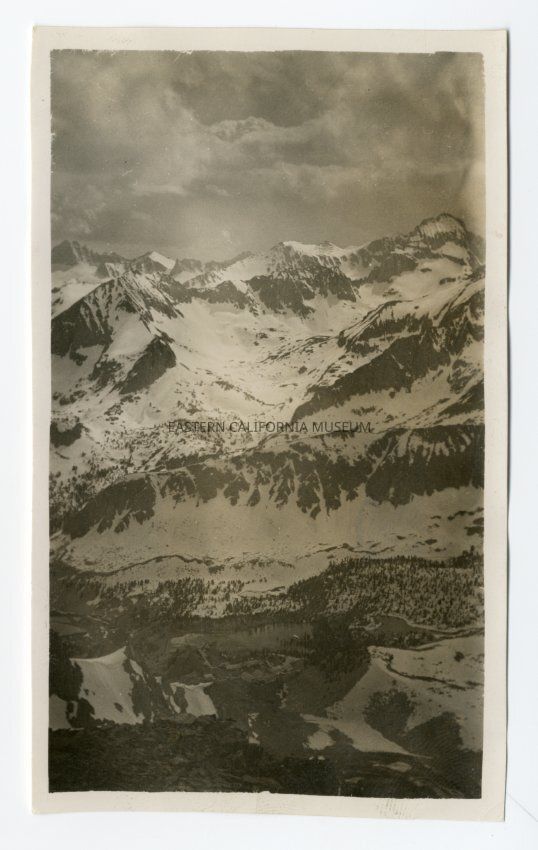 Black and white photo of mountains covered in snow. Lakes barely visible at bottom.