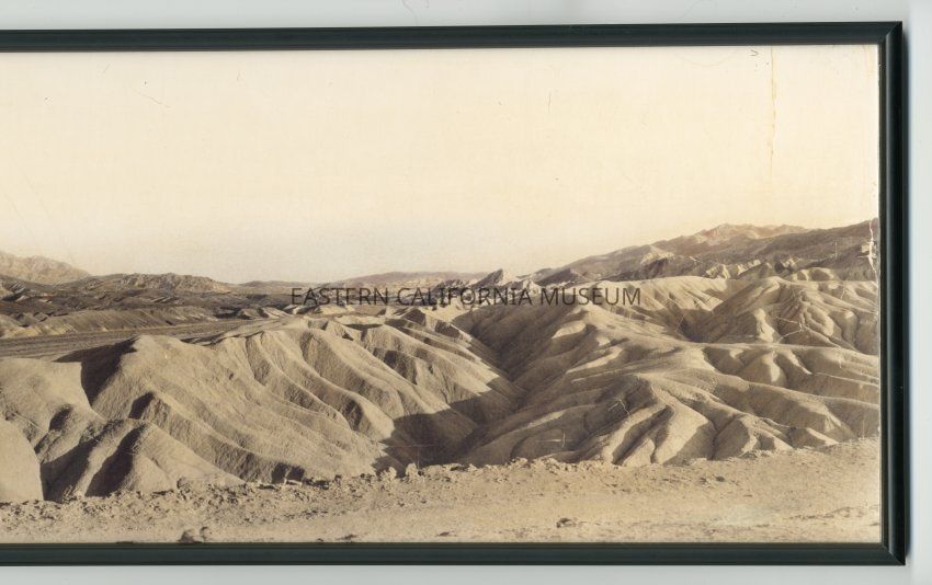 This framed sepia-tone photograph is one half of a diptych of Zabriskie Point in Death Valley, 1931. It is the right side panel, and it shows the landscape with a dirt road in the lower left side of the photo.