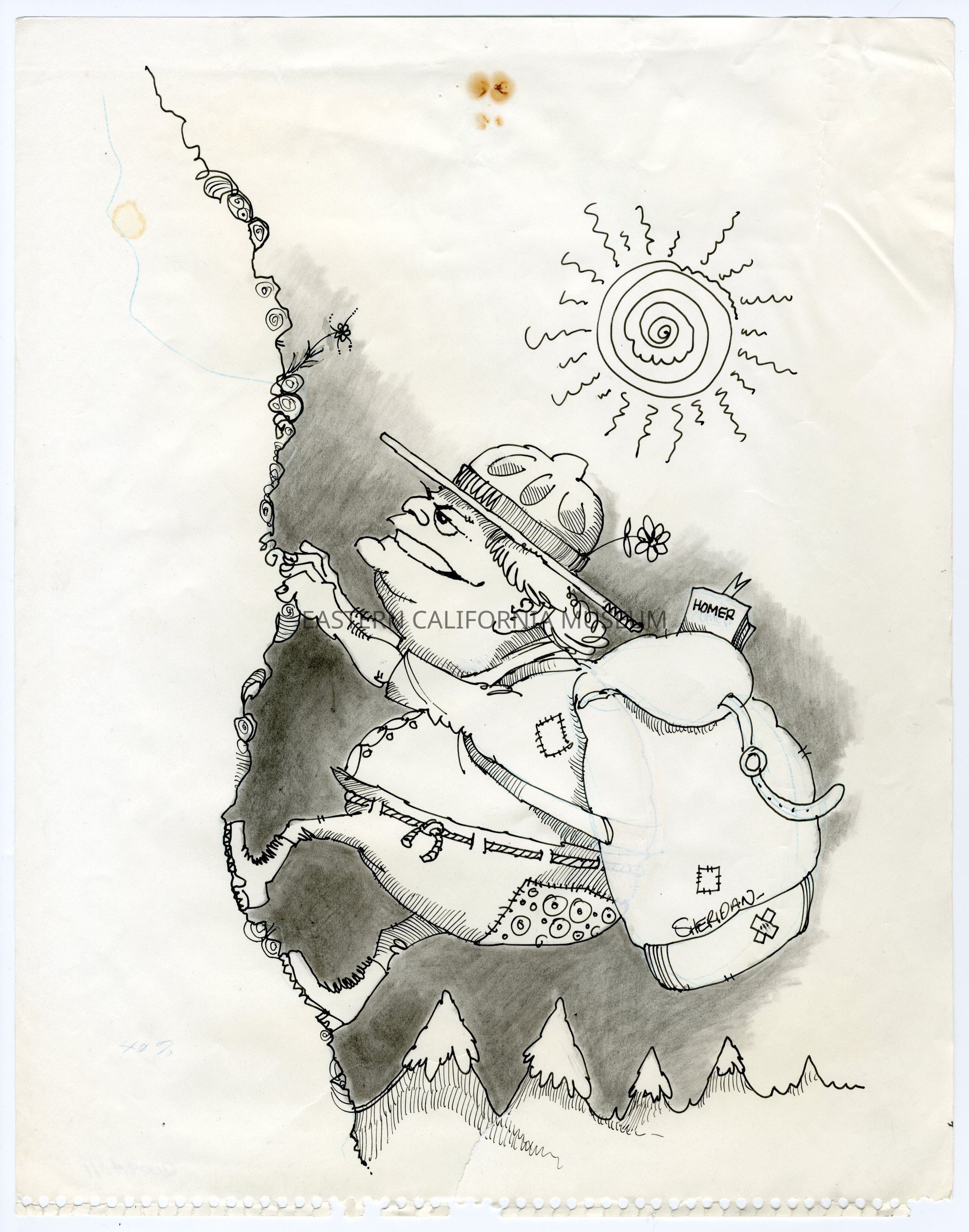 A cartoon of Norman Clyde drawn by Sheridan in the late 1960s and given to Jules Eichorn. The paper has been torn out of a spiral bound sketchbook.Collection