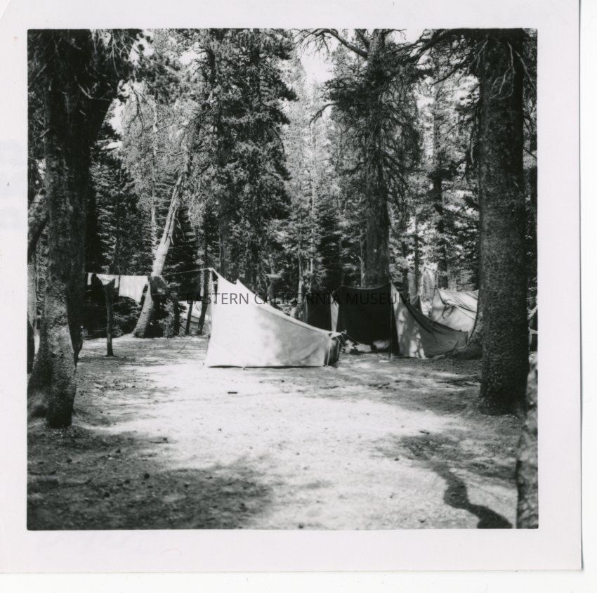 B&W glossy print: campground area, several tents surrounded by pine trees