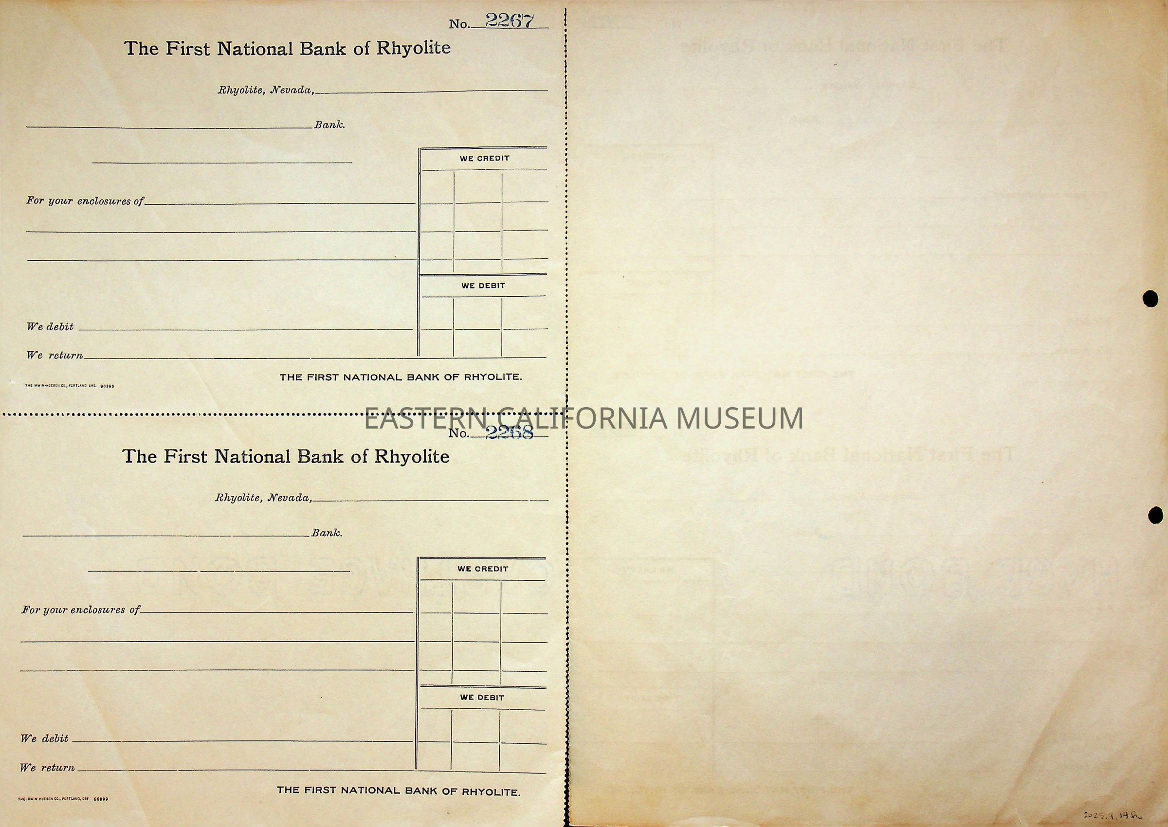 11. Blank check, First National Bank, Rhyolite. Has an image of a building in the upper left corner.
