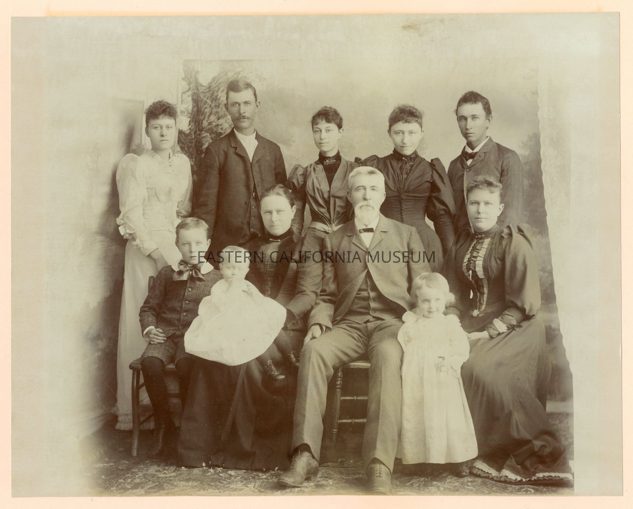Written in ink on reverse: Mr. and Mrs. John Shepherd children and grand children. Oct. 1892. John Shepherd age 58 yrs., Margaret Shepherd, age 47 yrs., James Edward Shepherd, age 31 yrs., Eva Lee Gunn, age 28 yrs., Luella Butler, age 26 yrs., May Alice Conklin, age 24 yrs., Dora Alma Holland, age 18 yrs., John Arthur Shepherd, age 16 yrs., George Lester Shepherd, age 9 yrs., Helen Margaret Gunn, age 27 months, Mollie Irene Conklin, age 15 months.