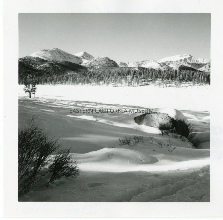B&W glossy print: snowy meadow with snow covered mountains in background