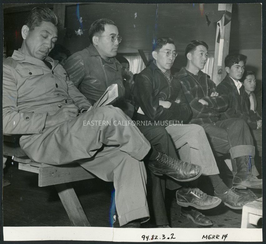 A group of residents of Japanese descent listening to the purpose of the registration which was held at this center. The registration forms were explained to the evacuees by WRA and Army officials.Entry/Object ID